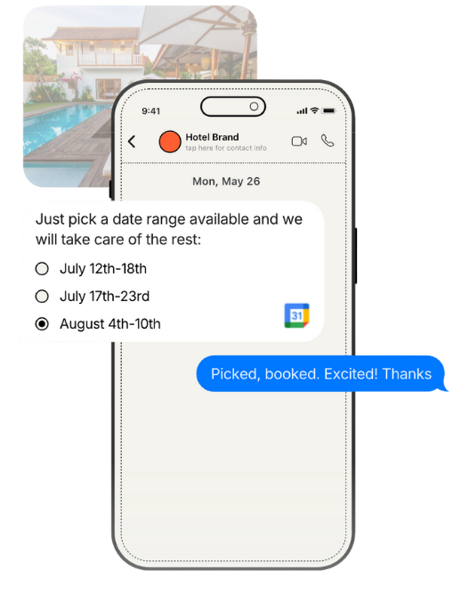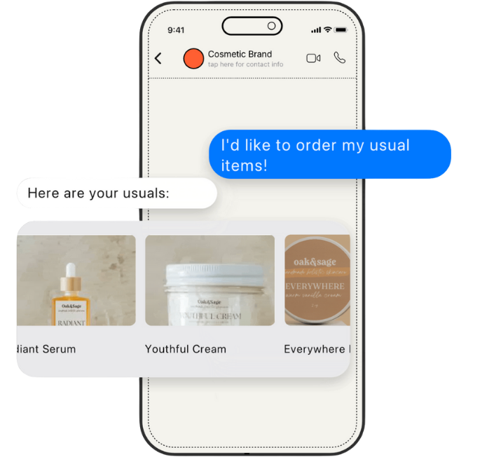 Let customers discover, choose, and complete a purchase or reservation inside Messages, WhatsApp, and Instagram. No app install. No link hopping.